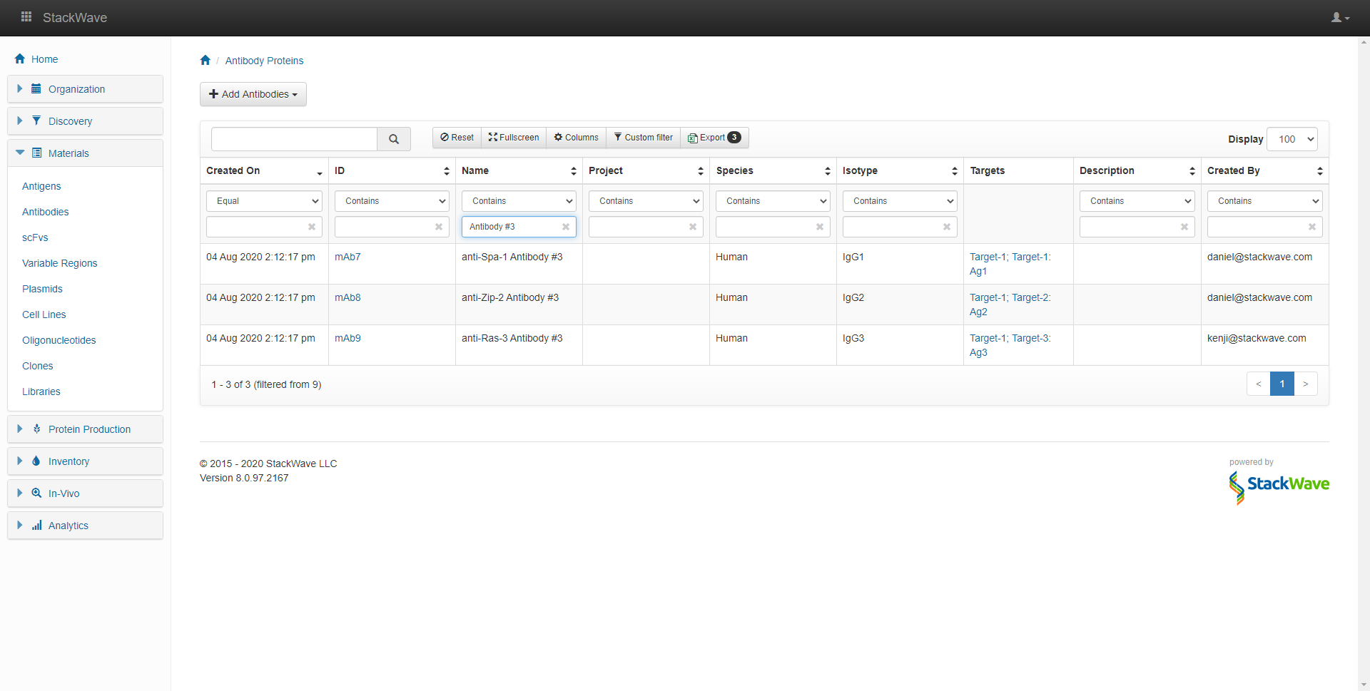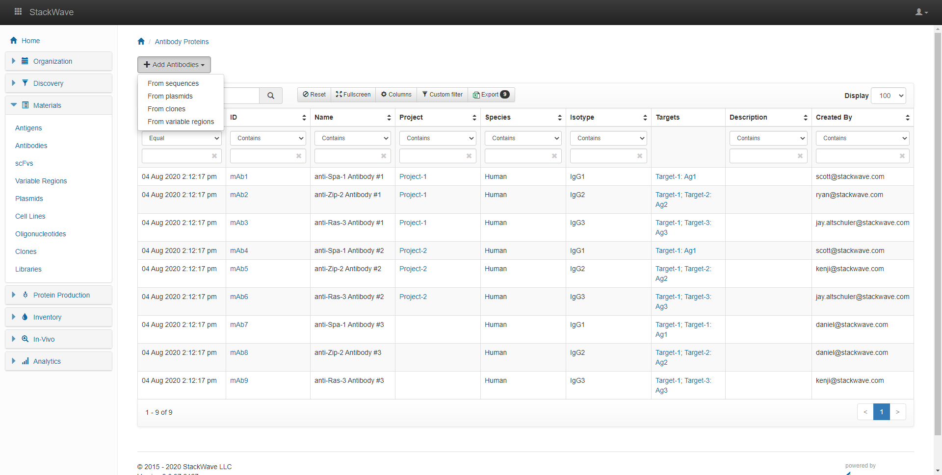 The StackWave Fidelity Platform makes it easy to work with antibodies by providing support for related material types, such as plasmids.