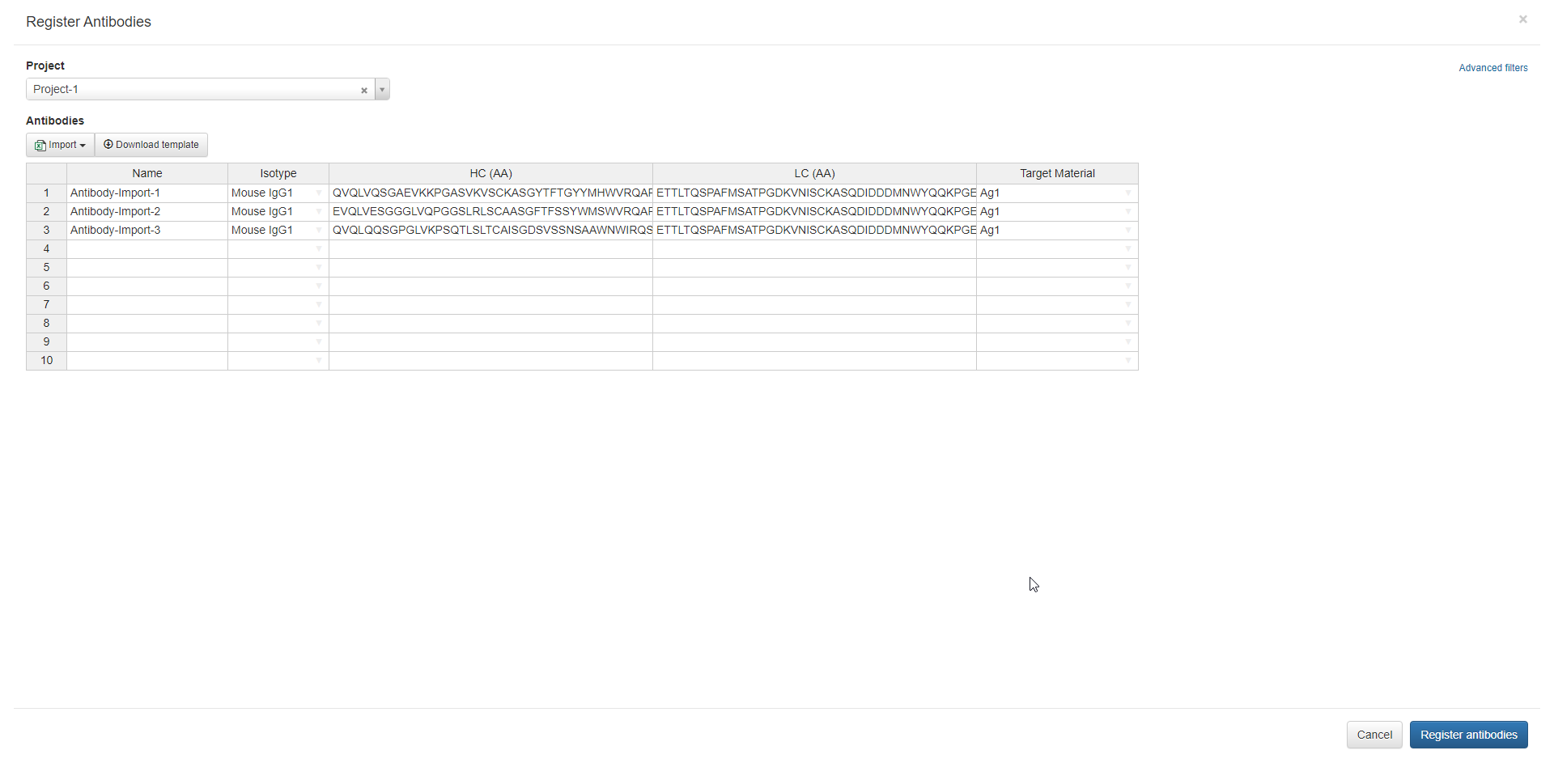 If you already have antibodies described in a formatted Excel Spreadsheet, you can quickly upload them using our in-browser spreadsheet registration interface.
