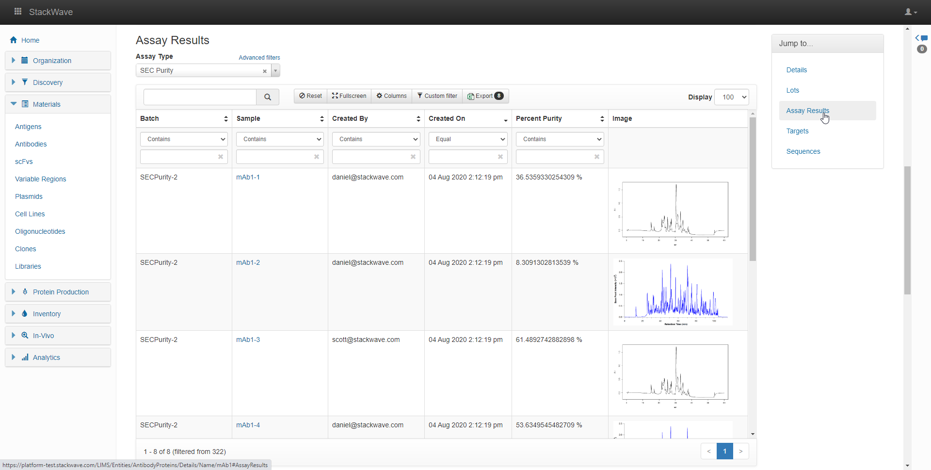 View all of your assay data quickly for a selected antibody. The StackWave Fidelity Platform supports a variety of assays, with the ability to define new assays over time