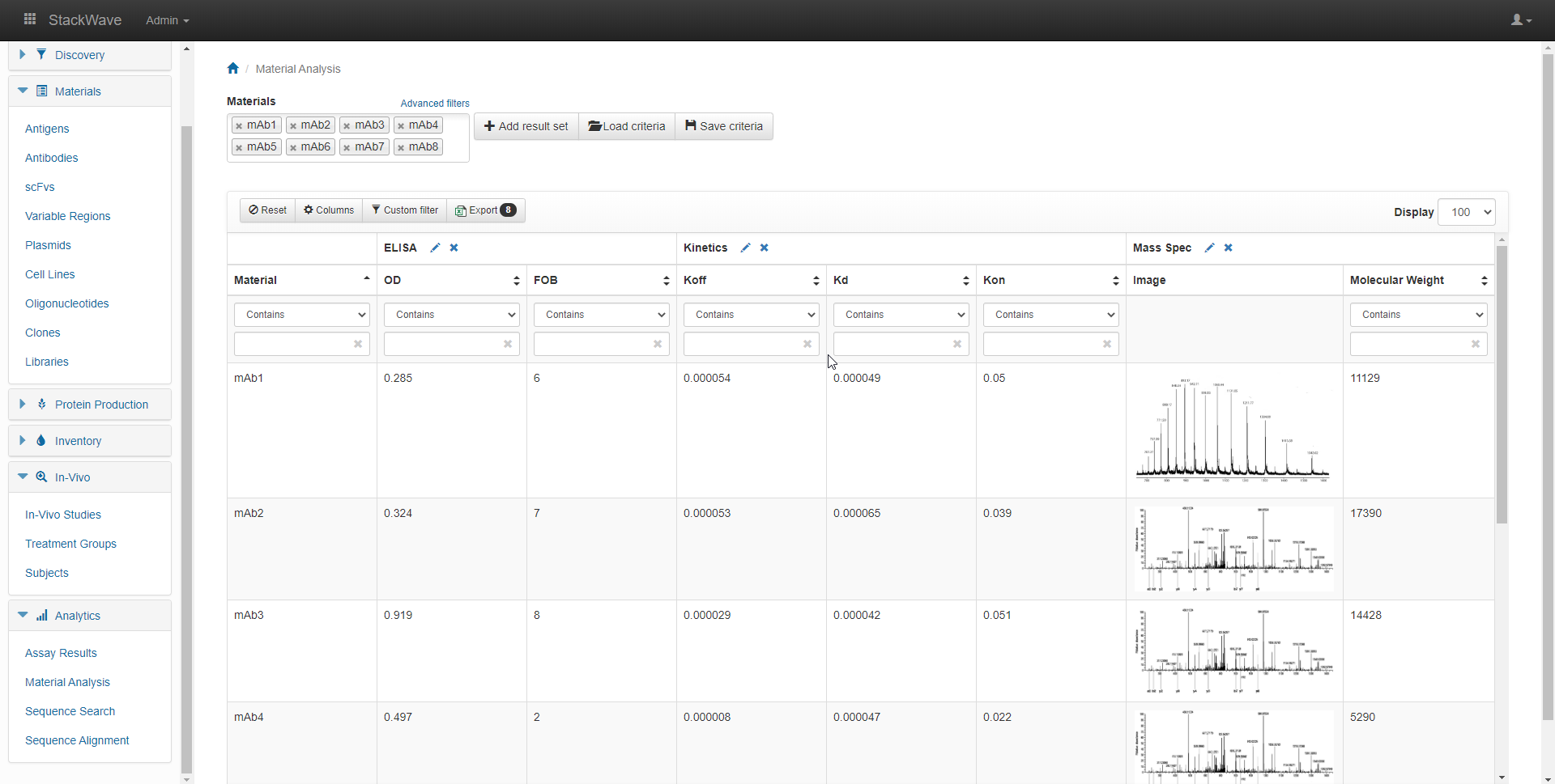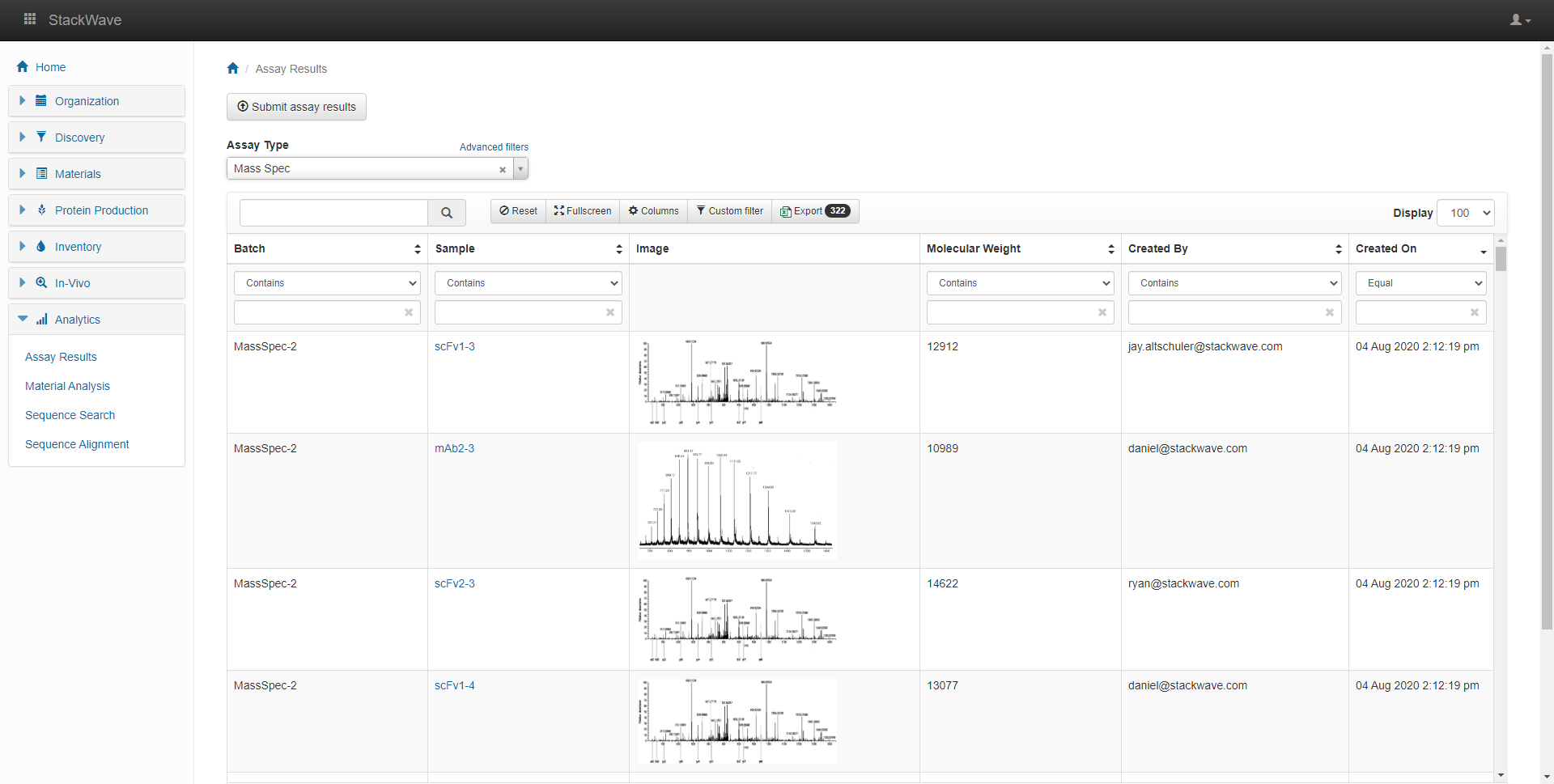 Store all of your assays results in the same system as your materials to avoid the headaches that come with storing data in silos. Use the same, easy-to-use, StackWave components with which you are already familiar to search, sort, and export results.