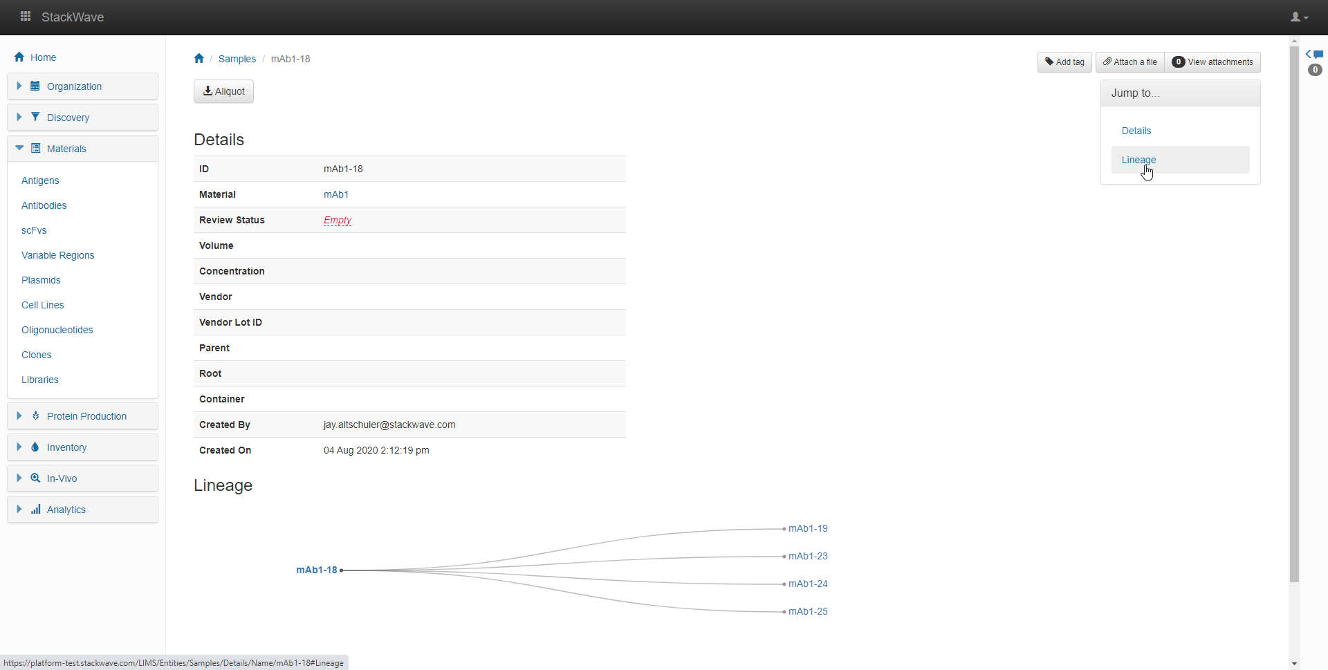 The StackWave Fidelity Platform maintains a comprehensive log of all system actions and sample relationships. The sample details page gives you an immediate view into the lineage of any registered sample.