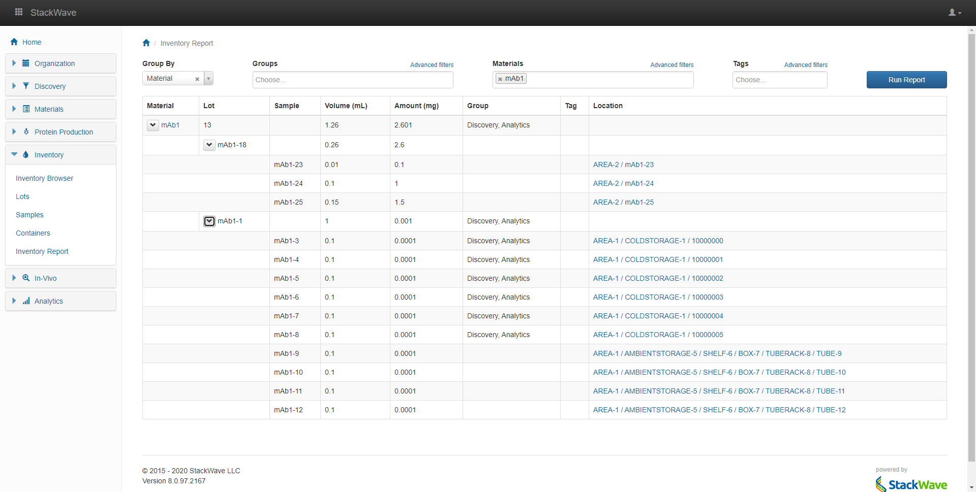 If you are looking for a single lot of a particular material or are just curious about how much volume is left of an important reagent, the inventory report can help you find whatever you need quickly and efficiently.