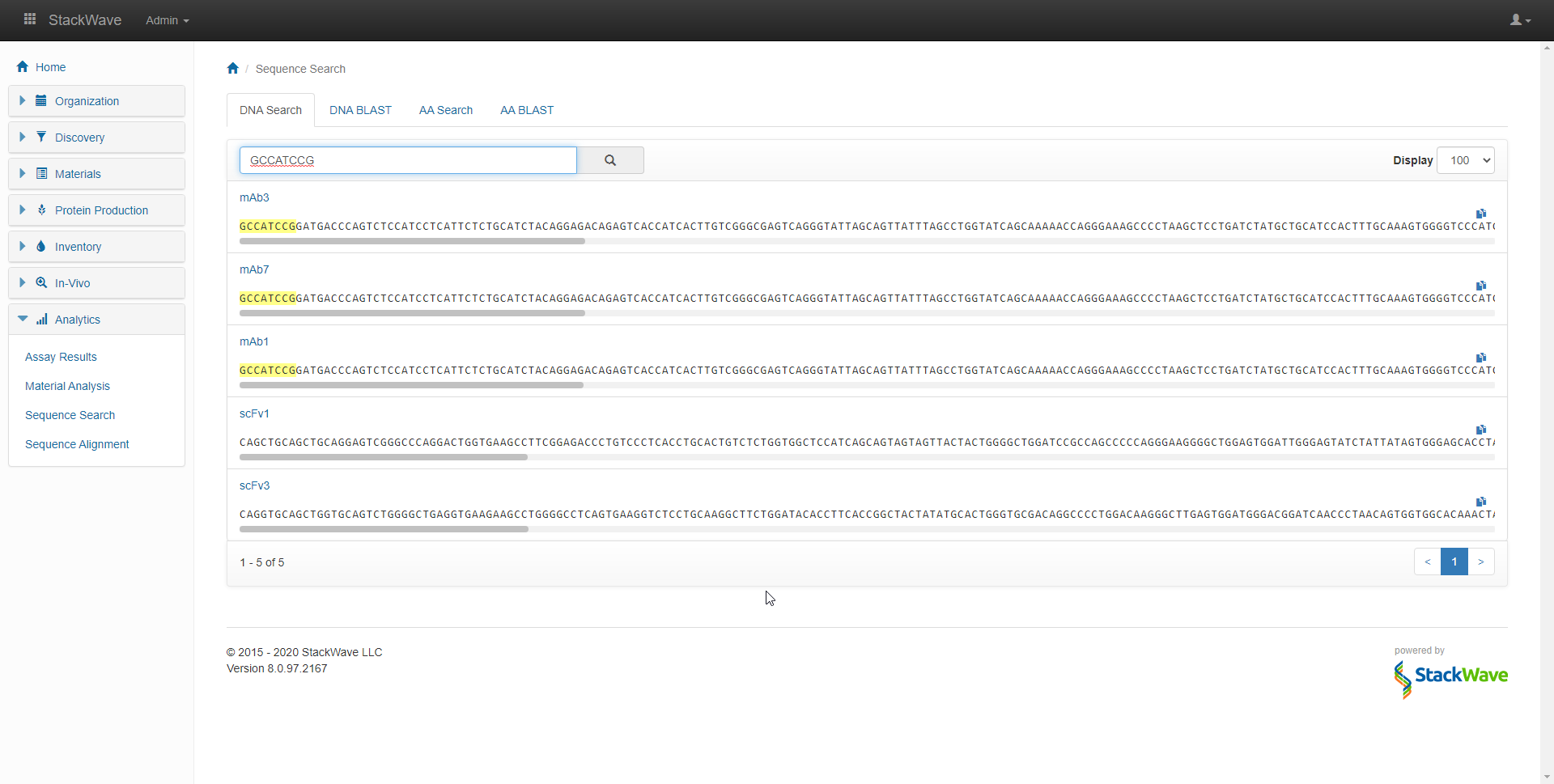 Use a variety of sequence search tools to quickly identify sequences and sequence elements in your antibodies, vectors, variable regions, and oligonucleotides. Anything with a sequence can be discovered and reported on, with a direct hyperlink in the result of your search.