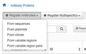 To register antibodies in Affinity, click on Register Antibodies in the upper left of the Antibody index page, then select from sequences, plasmids, clones, variable regions, or variable region pairs.