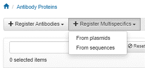 Multispecifics are a type of antibody which are not limited to the traditional single HC/LC combination. To register a multispecific antibody, click Register Multispecifics and then select either From plasmids or From sequences. This selection affects which information is required for registration, either a series of sequences or a series of plasmid selections.