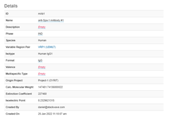The details section allows users with proper permissions to edit the name, description, phase, format, valence, and multispecific type of an antibody. It will also display the calculated attributes, such as Molecular Weight, Extinction Coefficient, and Isoelectric Point.