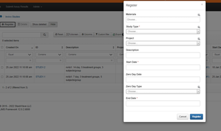The In-Vivo Studies index page allows the user to review the list of studies which have been registered in the system. The index page will show the created date, ID, description, project ID, project name, materials associated with the study, start and end date, zero day date, and study type.
