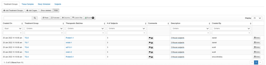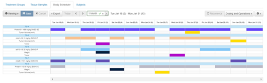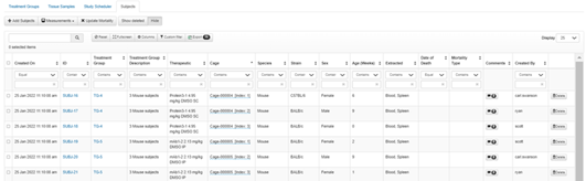 In-Vivo Studies, along with the associated treatment groups and subjects and a schedule of dosings and operations can be registered in the In-Vivo module
