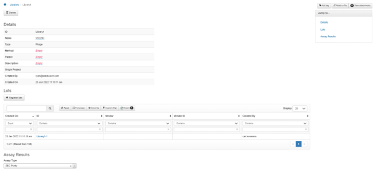 Finally, Assay Results allows users to review any assay data loaded against samples of this material. Select an Assay Type to display all results of that type for all samples of the given library.