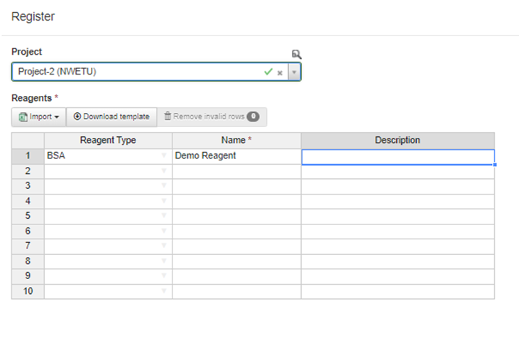 Register reagents using the button at the top left of the reagent index page. The resulting form will allow you to manually enter data or import XLS files for registration of larger numbers of reagents at a time.