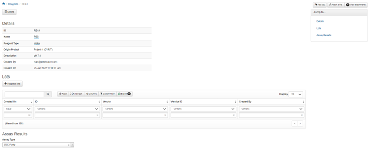 Finally, Assay Results allows users to review any assay data loaded against samples of this material. Select an Assay Type to display all assay results of that type for all samples of the given reagent.