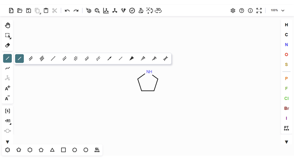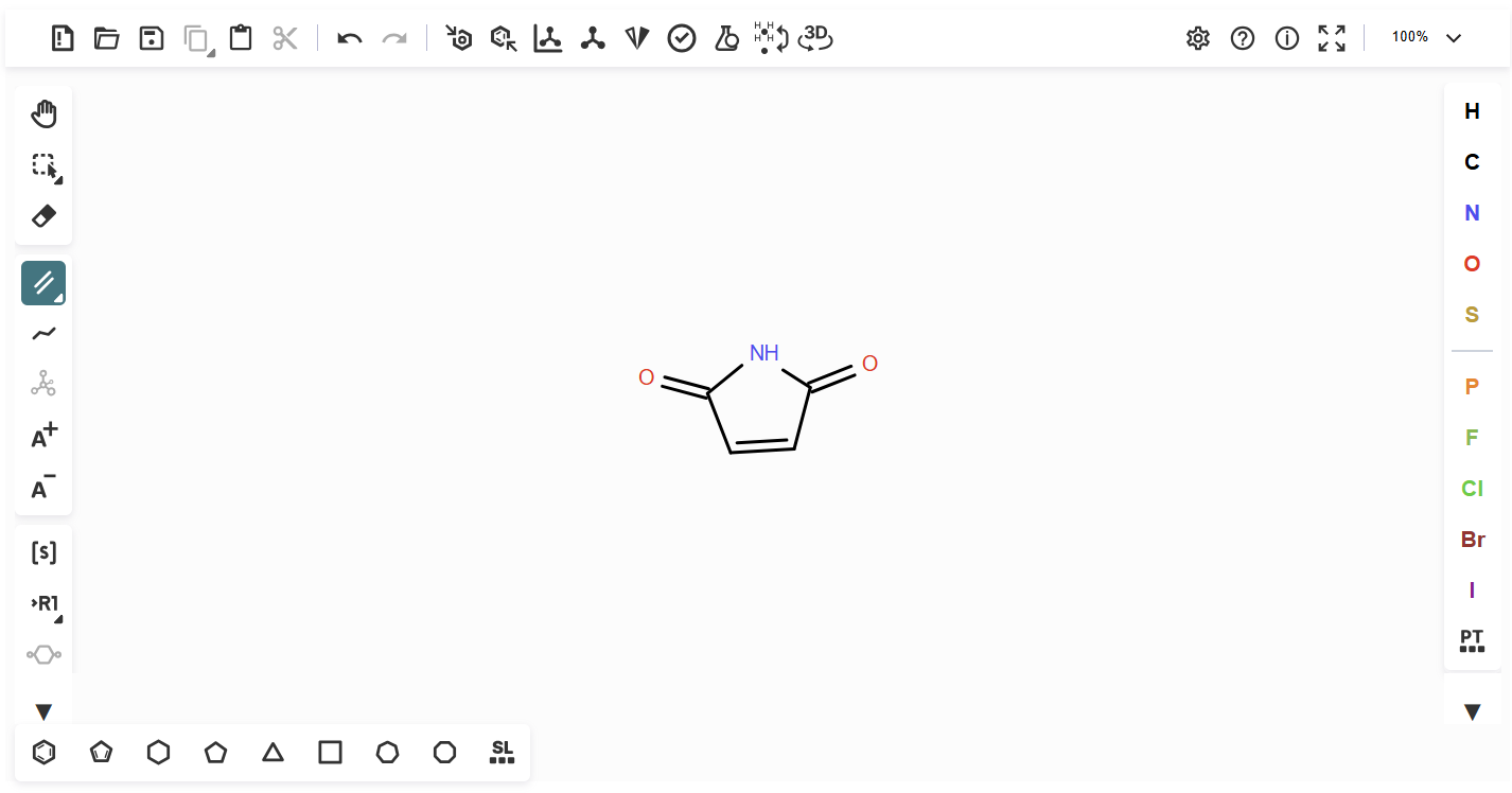 To demonstrate the use of the chemical sketcher, we’ll draw the format for maleimide and use it to create an antibody conjugate. The backbone for maleimide is a five-member ring, so we’ll first click on the five-membered ring icon in the bottom toolbar, then click into the middle of the canvas to place it.