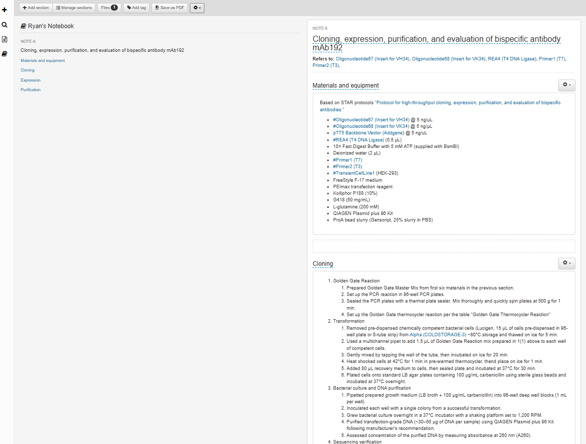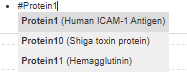 Within a note, it is often useful to be able to create a link directly to a reagent within Affinity. To do this, type the # symbol into a free-form text field, and then begin to type the reagent’s ID to search the bioregistry and display reagents that match. Select the desired reagent to create a direct link to its page in Affinity. For example, linking to #Protein1 will allow you to create a link from your note to Protein1’s page. Additionally, the note will be listed and hyperlinked under the “Related Notes” section on that page.