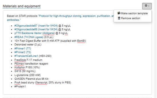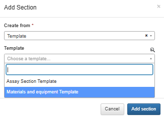 Section and note templates can be used to save commonly-used formats for composition. To create a section template from an existing section of your note, click the gear in the upper right-hand corner of any section and choose Make Section Template. Similarly, clicking the gear at the top of the note and selecting Make Note Template will create a template from the entire note. When creating new notes or sections, you can change the field Create From to Template and select from available templates.
