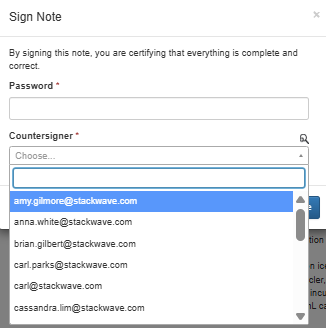 You will be required to enter your Affinity password, and then select a user for countersignature. They will receive an email indicating that you have requested they review and countersign the note. This request will also appear in their personal dashboard, available from the My Dashboard link at the top of every page.