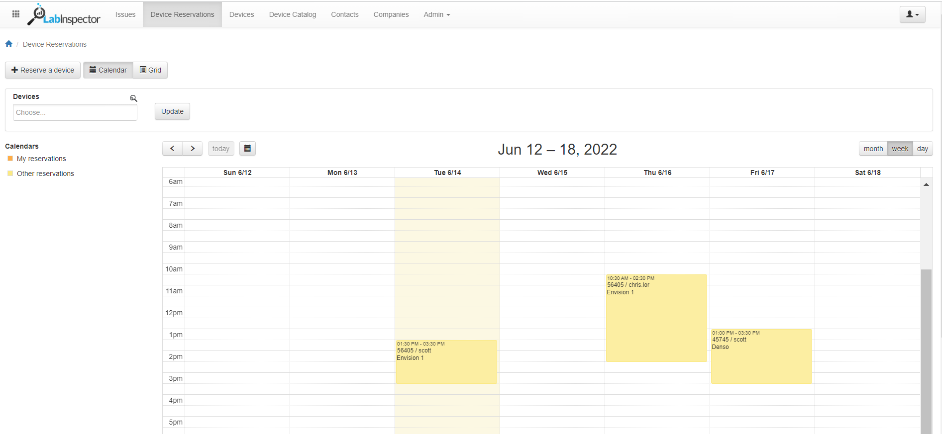The default view of the Device Reservations page is a calendar displaying the device reservations of the current week. The time frame can be edited using the buttons on the right, and the buttons in the upper left of the calendar can be used to change the dates being viewed. If the user would like to view reservations only for a specific device, the Devices search field can be used to narrow the reservations displayed. Clicking on My Reservations or Other Reservations will additionally filter the displayed reservations on the calendar.