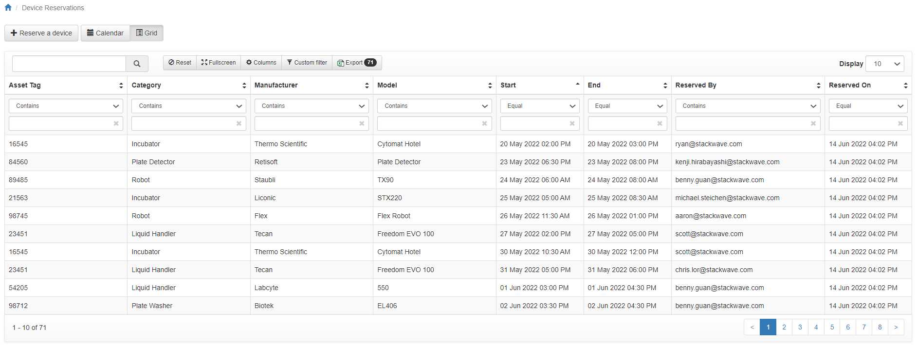 Clicking Grid at the top of the page will change the view of reservations to a grid format, allowing the user to sort reservations as needed or filter as they see fit. The search bar in the upper left can be used to locate specific reservations along with the search tools in each column. The custom filter button allows for definition of more complex filters if needed. The export button can be used to download an excel report of whichever columns are of interest.