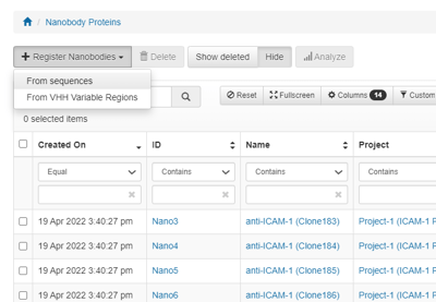 To register nanobodies in Affinity, click on Register Nanobodies in the upper left of the Nanobody index page, then select from sequences or VHH Variable Regions.