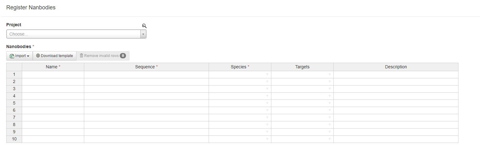 When registering from sequence, users can optionally select a project, and then enter the name, sequence, and species of the nanobodies in question. Users may also optionally associate one or more targets and a description with a nanobody.