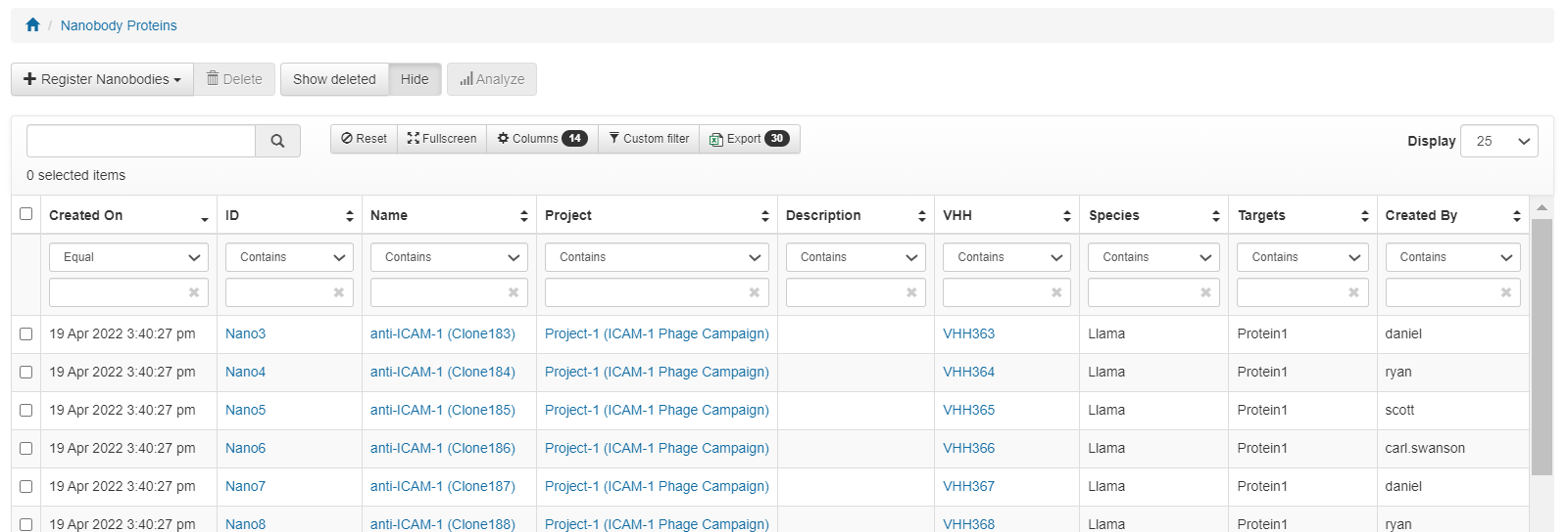 The index page for nanobodies allow users to review the existing nanobodies registered in the system. Filters can be applied on any column to narrow the displayed nanobodies. Click on an nanobodies' ID to navigate to its details page.